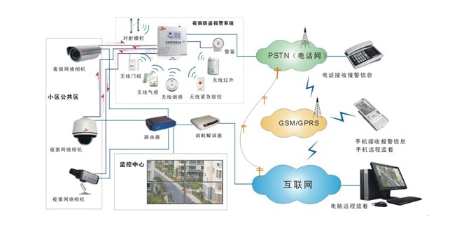 网络摄像机:采集现场图像,经压缩编码后通过ADSL网络传输出去,异地可通过监控终端软件或IE浏览器登陆,实时查看现场情况,可把视频图像保存起来,并能联动报警主机进行报警。